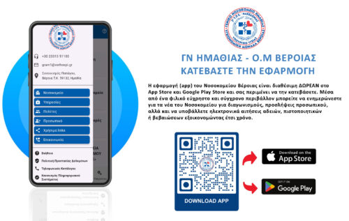 Η εφαρμογή (app) του Νοσοκομείου Βέροιας είναι διαθέσιμη ΔΩΡΕΑΝ στο App Store και Google Play Store και σας περιμένει να την κατεβάσετε. Μέσα από ένα φιλικό, εύχρηστο και σύγχρονο περιβάλλον μπορείτε να ενημερώνεστε για τα νέα του Νοσοκομείου, για διαγωνισμούς, προσλήψεις προσωπικού, αλλά και να υποβάλετε ηλεκτρονικά αιτήσεις αδειών, πιστοποιητικών ή βεβαιώσεων εξοικονομώντας έτσι χρόνο.